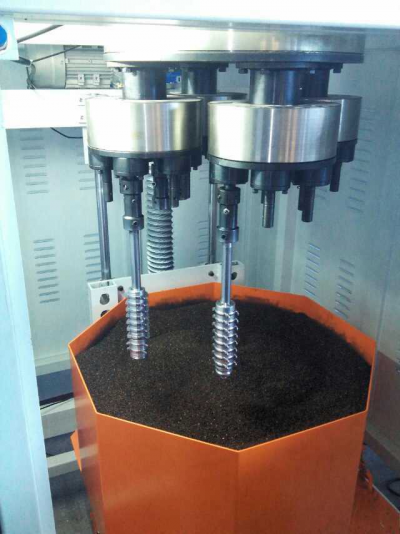 和研磨介质的不锈钢磨料桶组成。 在调速电机带动的回转机构上装有行星齿轮机构,工件夹头夹持着工件(刀具、珠宝、首饰、表壳、医疗器械等工件),夹头悬挂在行星齿轮传动转盘上,转盘带动工件公转和自转,每个夹头都能单独进行旋转.工件同时被缓慢向下插入到磨料桶中,直到工件的需要加工部分完全浸入介质中。在